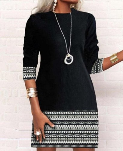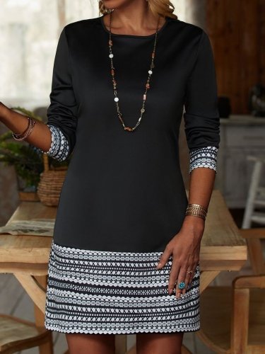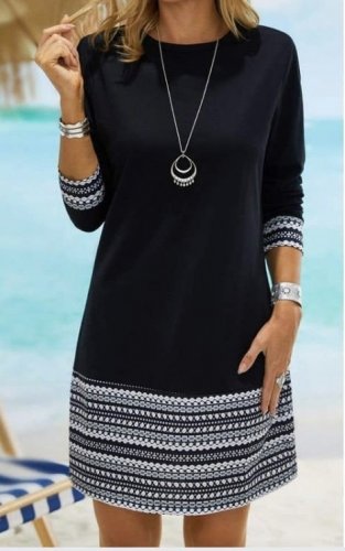 • Kadın uzun kollu bisiklet yaka etnik desenli detaylı iki iplik elbise